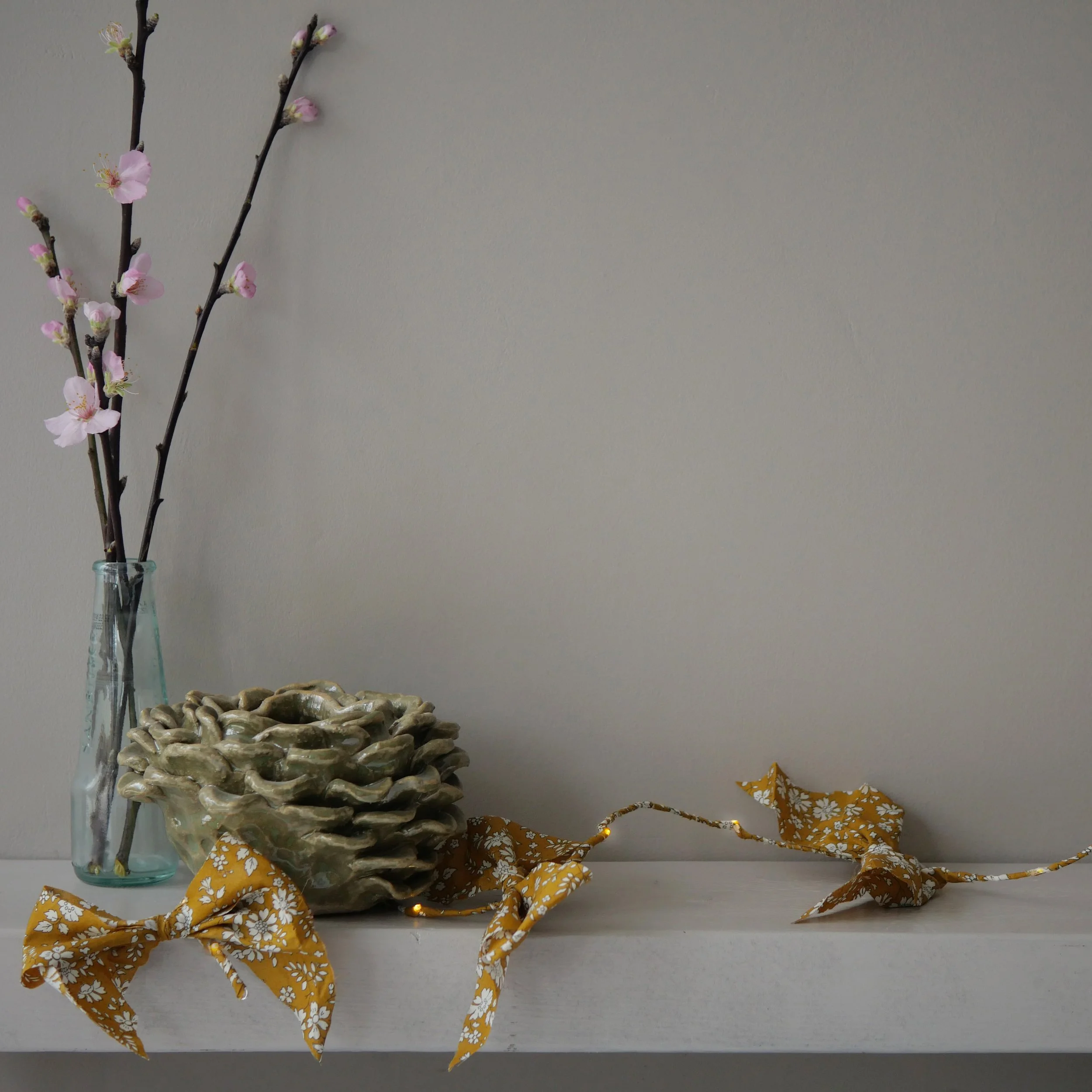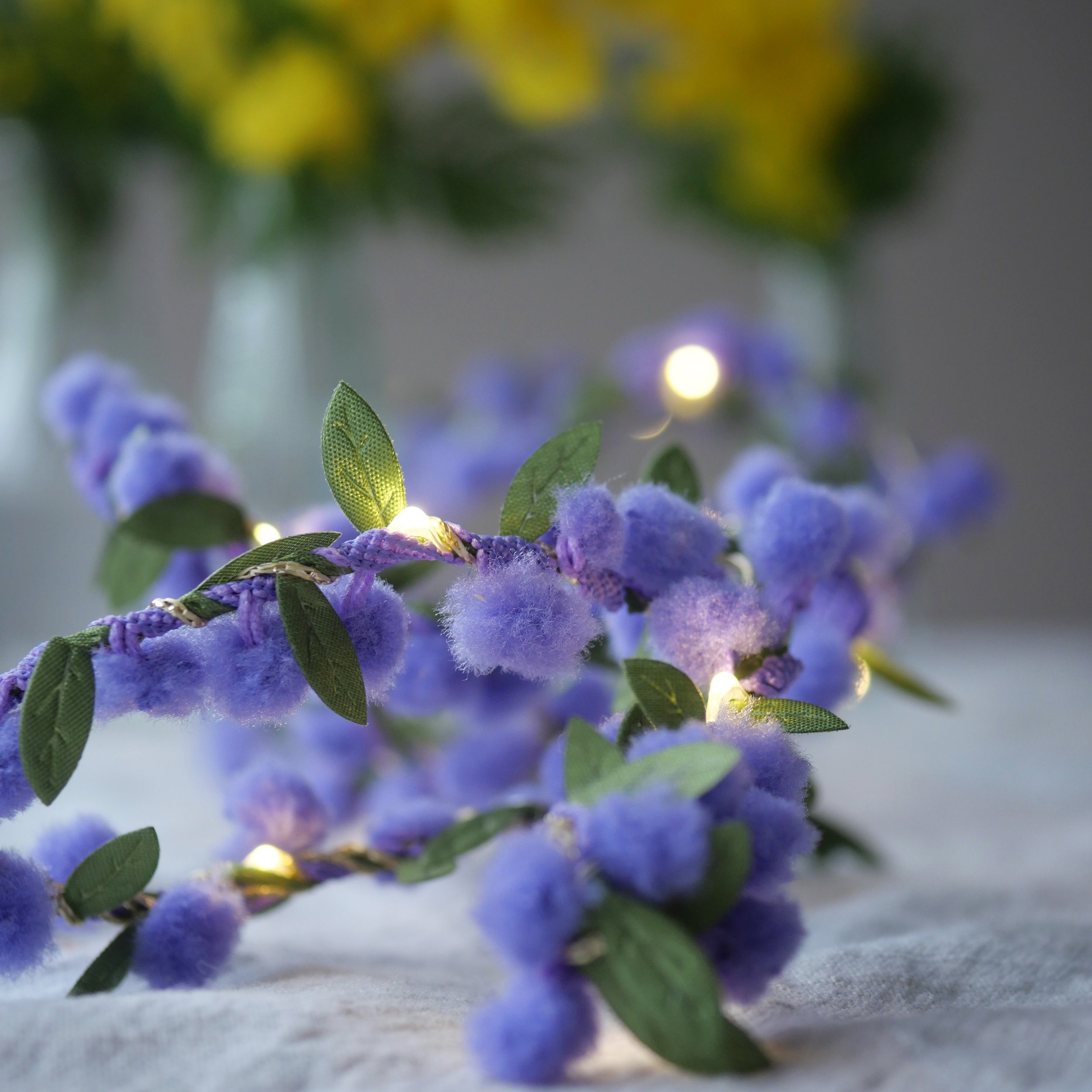 Handmade fairy lights crafted from metallic fibre and textured art yarn, inspired by the soft colours of wildflowers. Available in pink, green, yellow and chalk, with warm LED lighting for a gentle decorative glow.