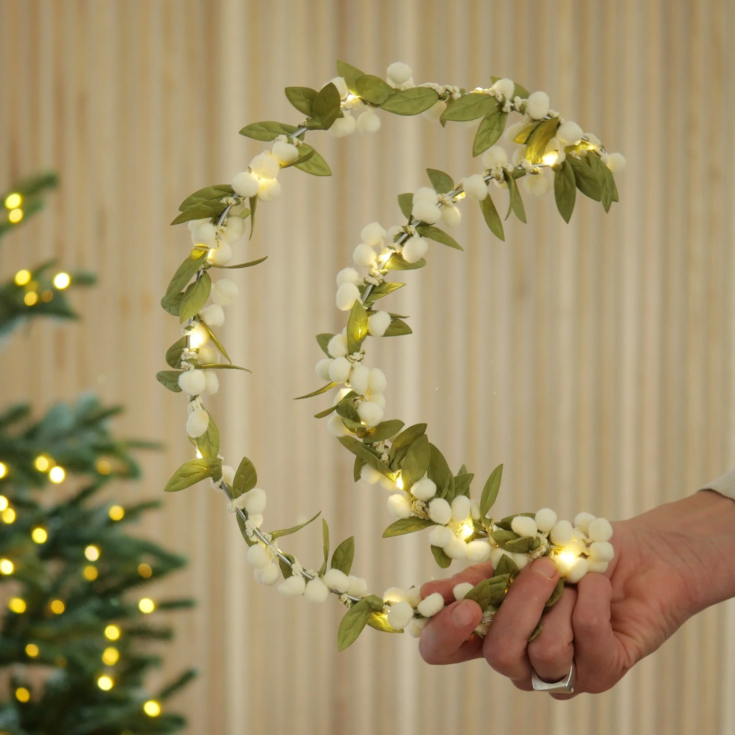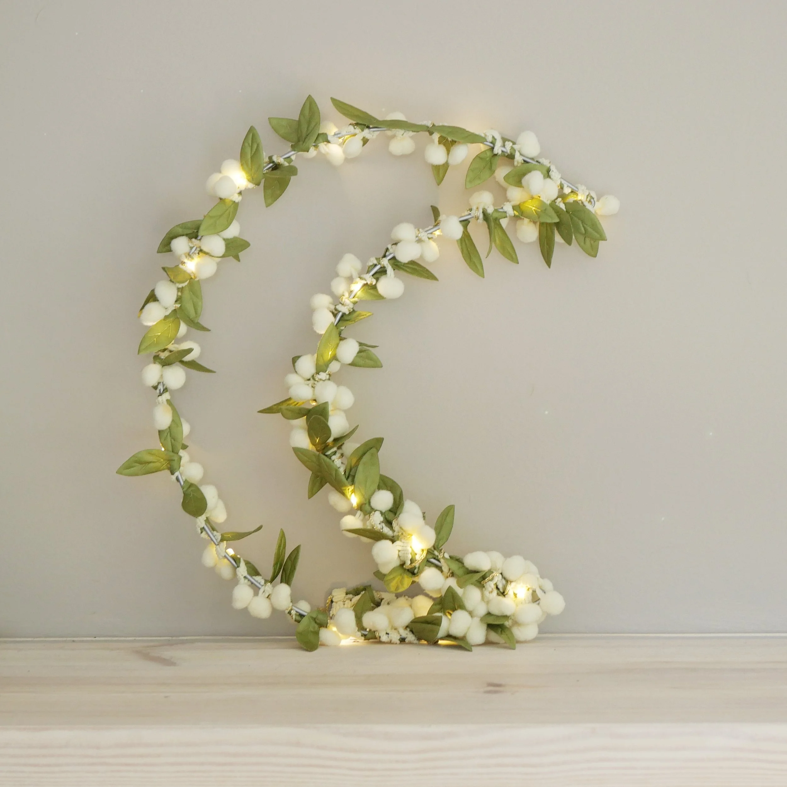 Bring a soft seasonal glow with our Mistletoe Moon Light! A timeless addition to any Christmas and Holiday decorations. Handcrafted in our London studio, soft cream poms and green leaves are hand-spun with metallic thread and warm white LEDs and wrapped around a metal frame. Hang in your window or place on your mantelpiece. Co-ordinates with our Mistletoe String Lights.
