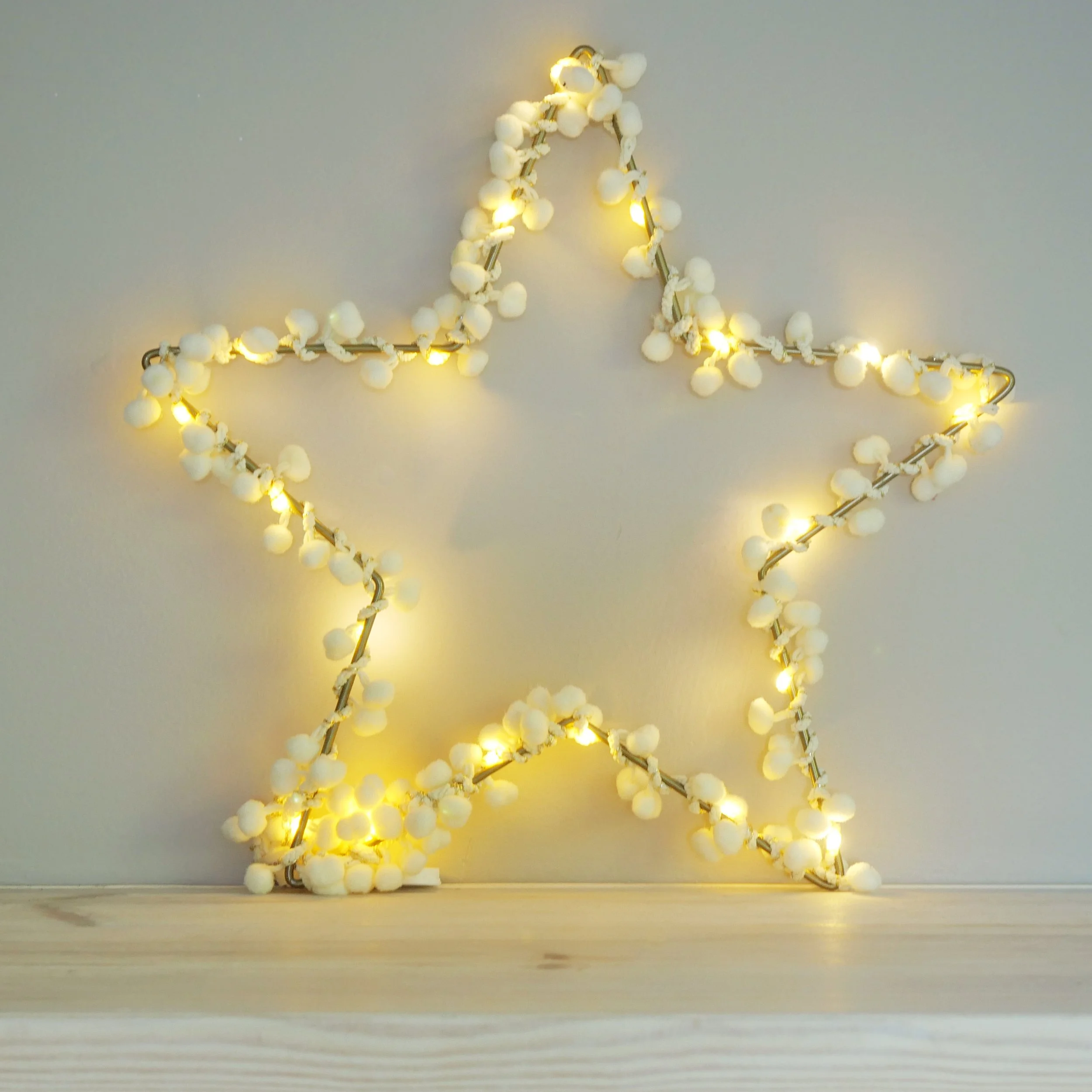 A timeless festive light to bring your Christmas and Holiday Season decorations a-glow! Makes a beautiful addition to a wall, window or mantle. Handcrafted in our London Studio, choose from Soft White Poms or Red Poms - hand-spun with metallic thread and warm white LEDs and wrapped around a metal frame. Coordinate with our matching Festive String Lights.