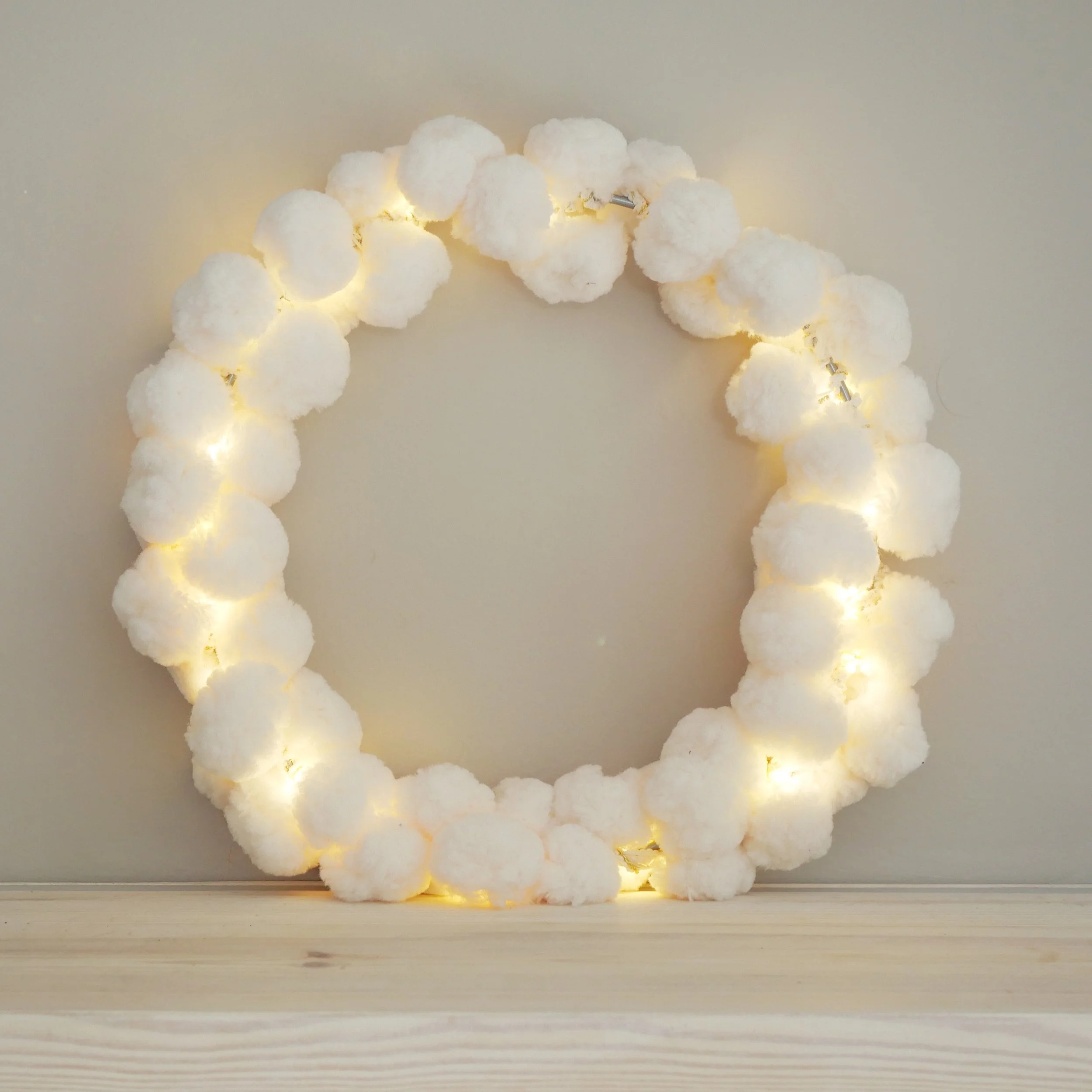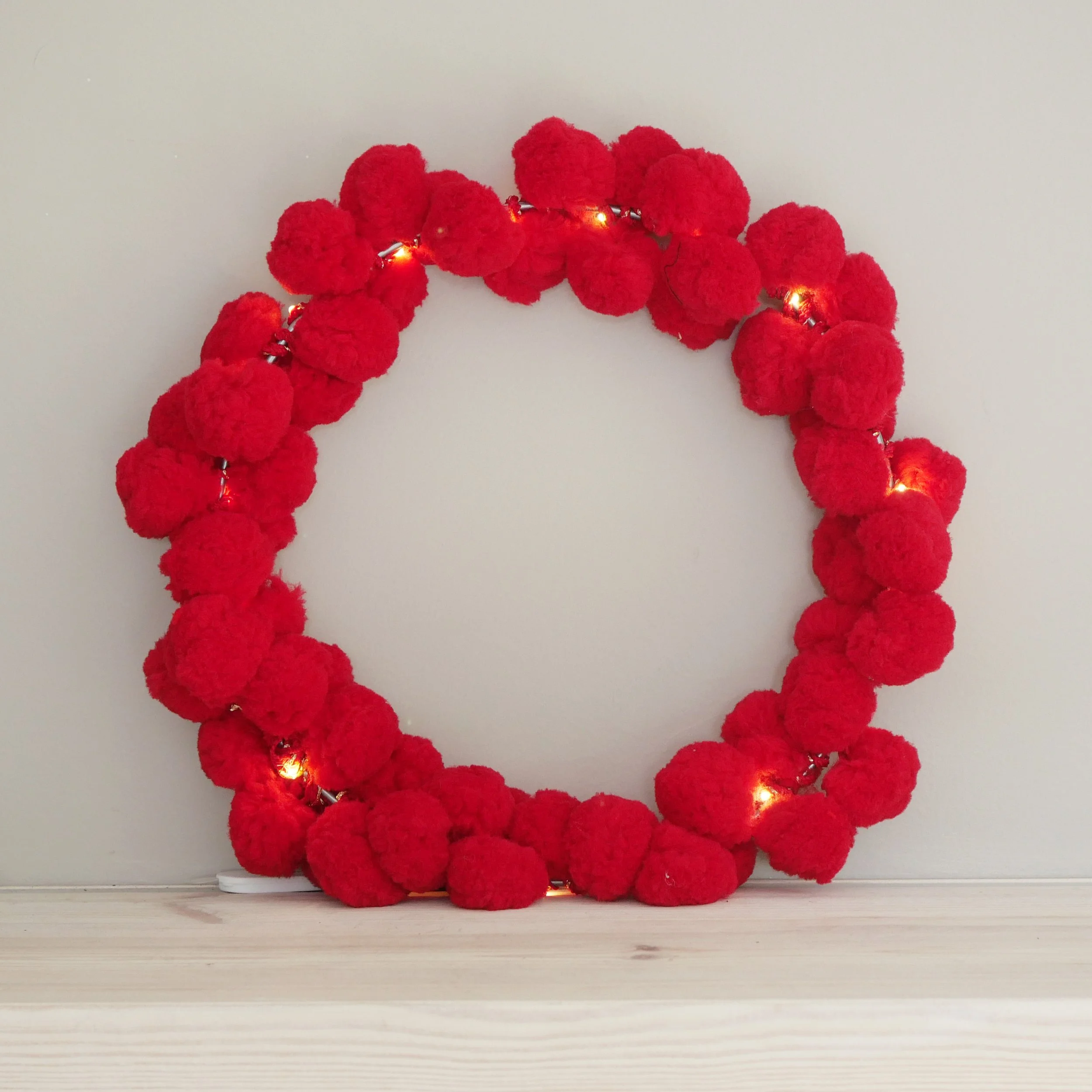 A beautiful festive Light Up Wreath. Giant red or white Pom Poms are hand-spun with warm white LED fairy lights. Beautiful illumination for a window, door or mantle. A lovely timeless addition to Christmas decor Co-ordinates with Giant Snowball Fairy Lights.