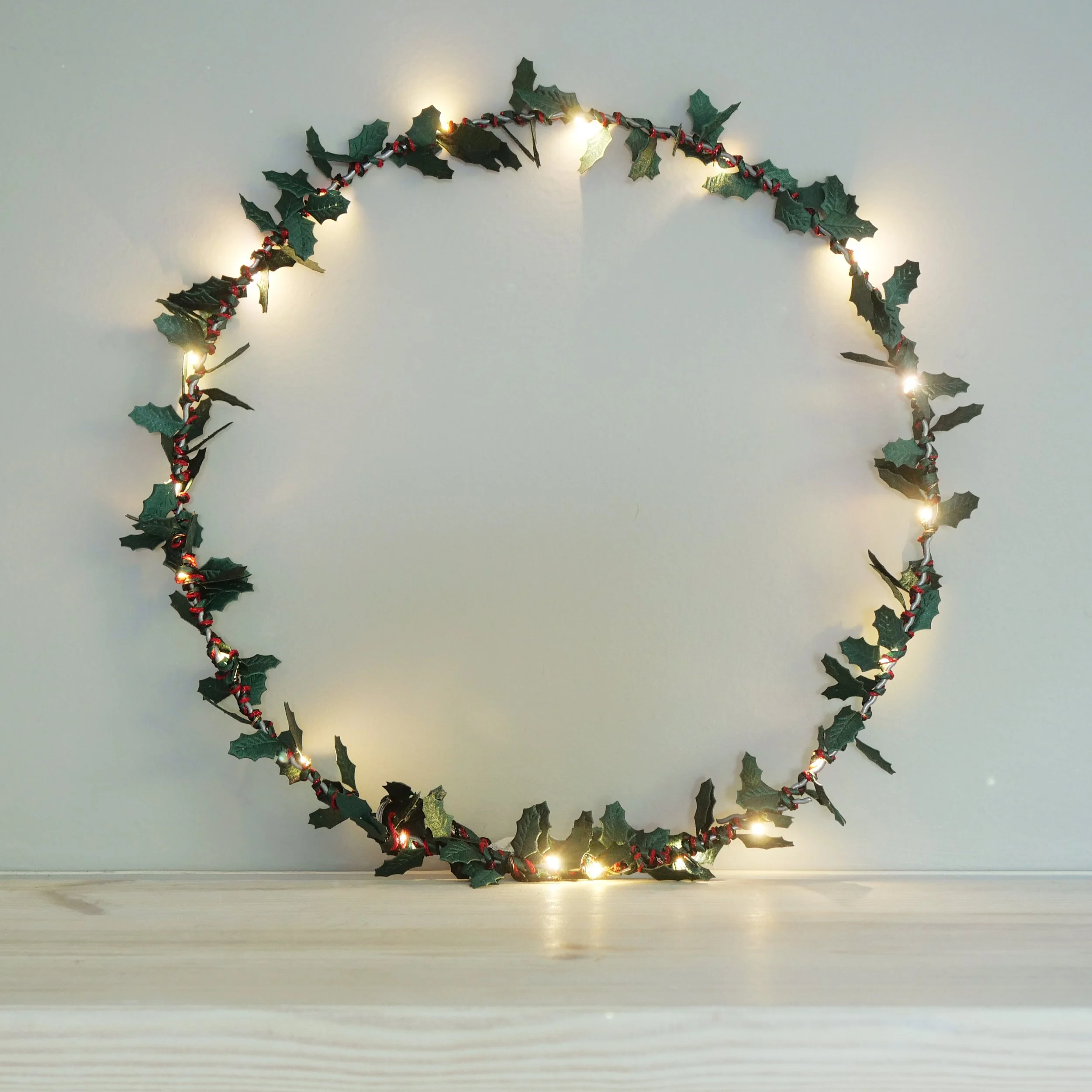 A beautiful festive Light Up Wreath. Holly leaves are hand-spun with warm white LED fairy lights. Beautiful illumination for a window, door or mantle. A lovely addition to festive decor. Co-ordinates with holly fairy lights strings and other holly shape lights. A beautiful timeless Fairy Light Wreath. Choose from Small (25cm) or Medium (30cm).