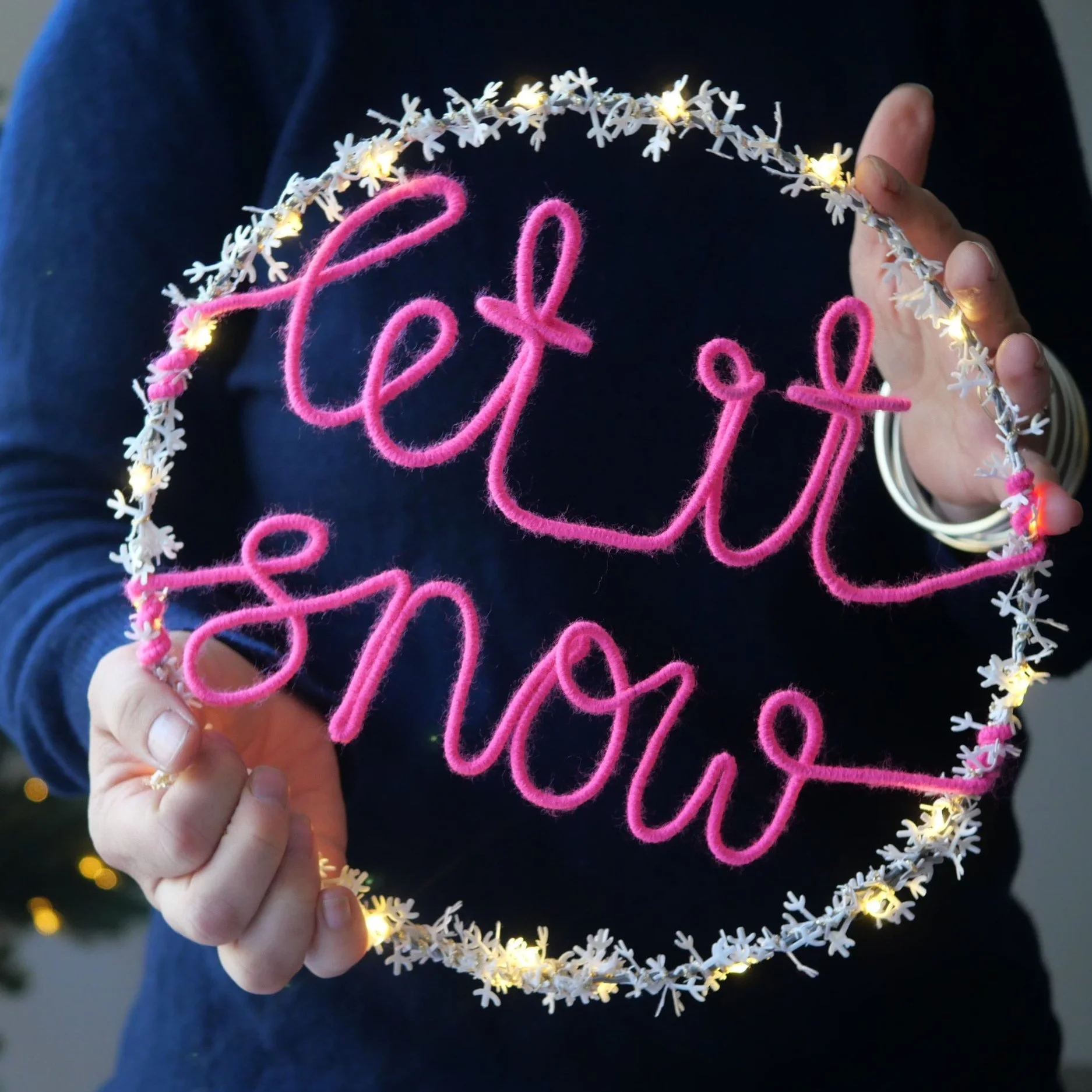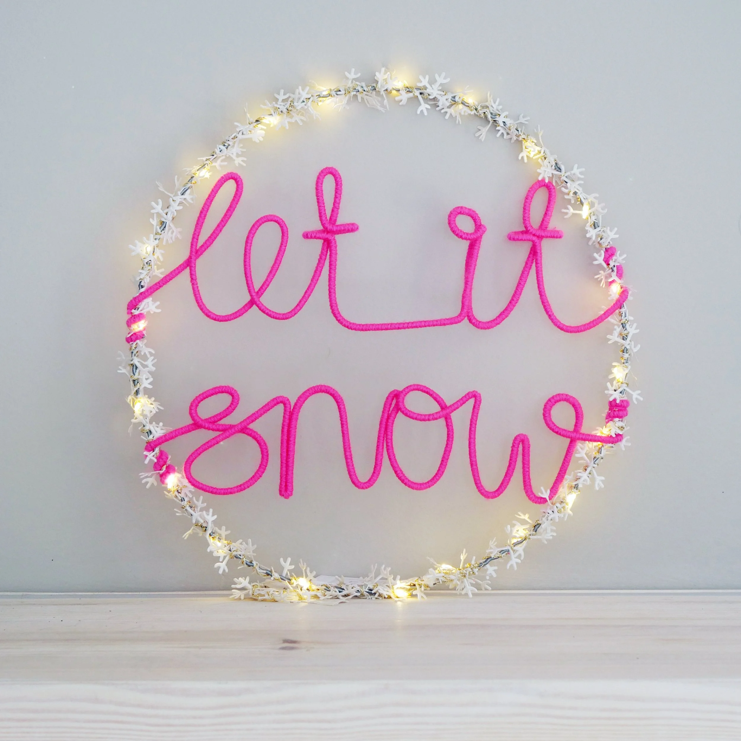 Welcome in a winter wonderland with our Snowflake Light Up Wreath. A delicate snowflake trim is hand spun with metallic thread and warm white LEDS, then wrapped around a metal frame. Let it Snow is hand-finished in neon pink writing. A fun festive slogan light for windows, walls and mantles. Co-ordinate with matching Snowflake Fairy Lights.
