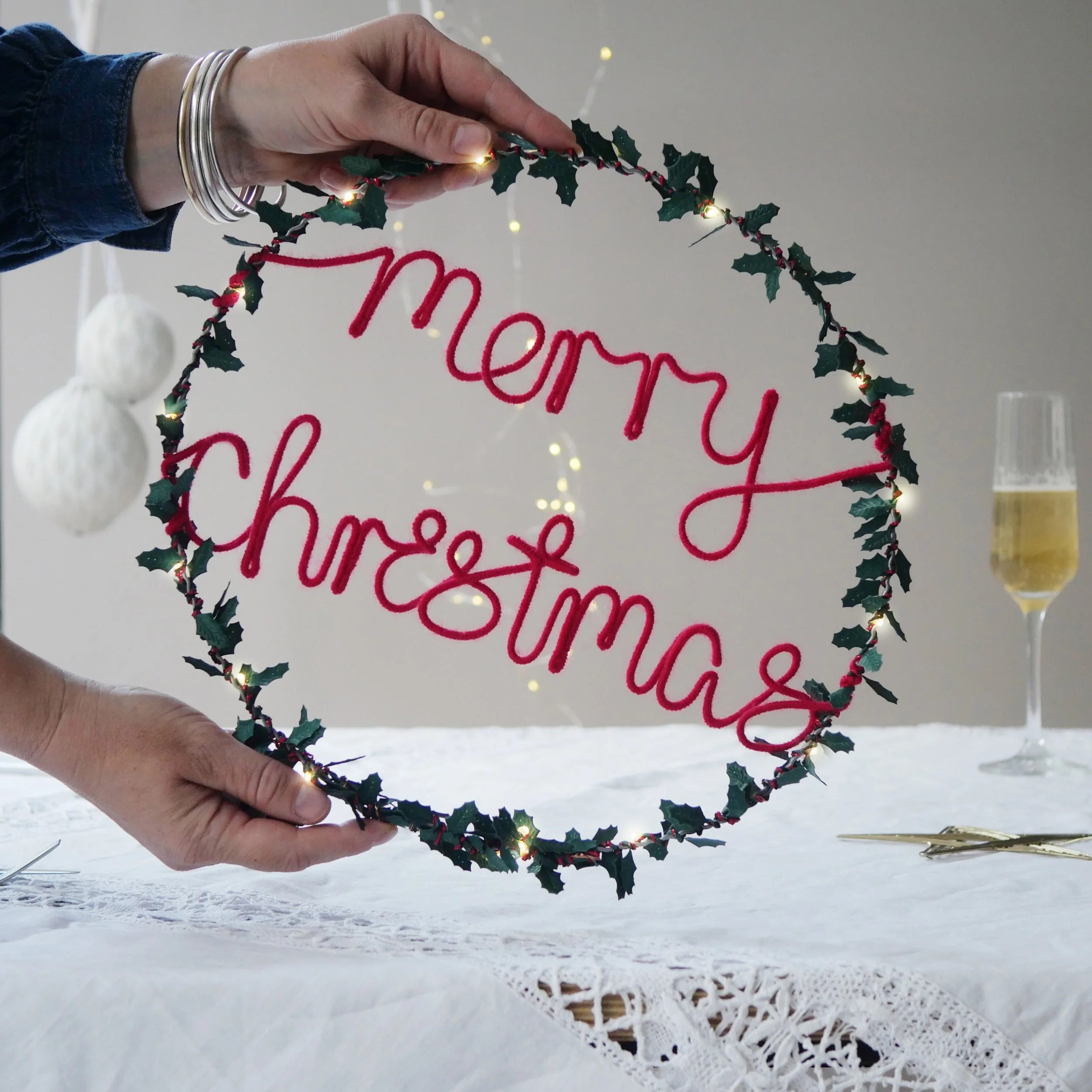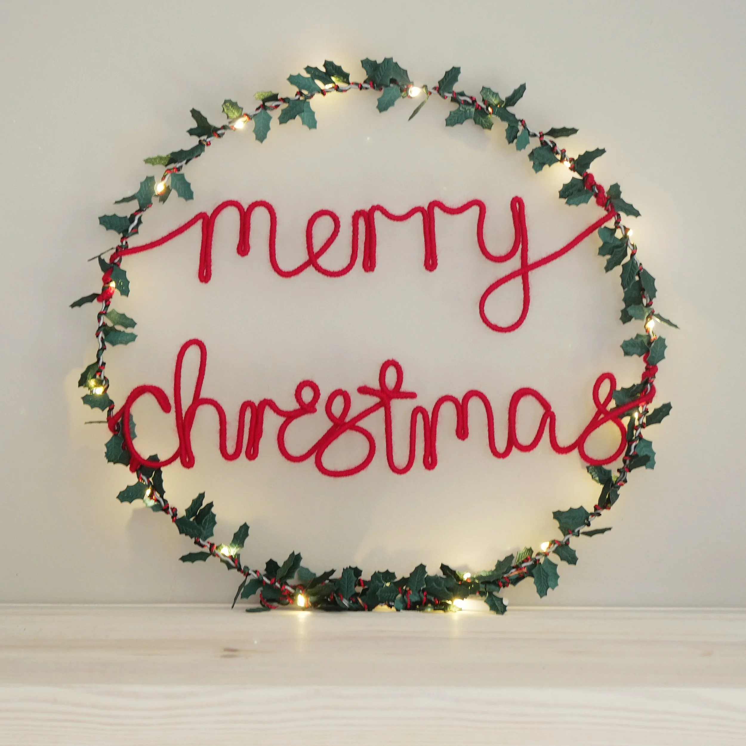 Designed for our Welsh customers. Celebrate the holiday season with our Nadolig Llawen Light Up Wreath, guaranteed to bring unique festive charm. Delicate holly leaves are hand-spun with warm white LED fairy lights and entwined on a metal frame. Choose from red or grey hand-finished writing for Nadolig Llawen - Merry Christmas in Welsh. Perfect for a mantle, window or door. Also makes a wonderful festive gift!